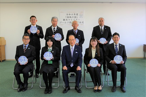 令和4年度「海風の国」観光マイスター・ゴールド検定試験合格者へ認定証授与式を行い記念撮影をする市長