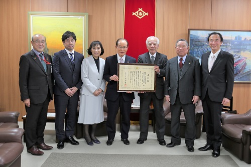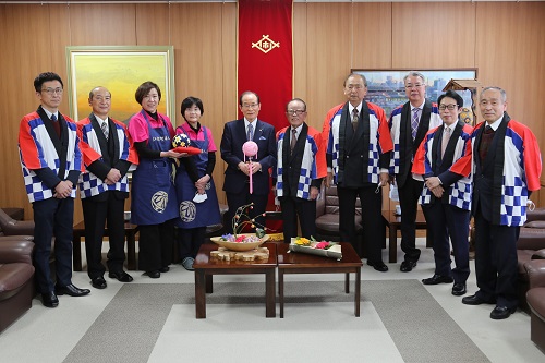 肥前えむかえ繭玉まつりの開催報告とPRのために市役所を訪れた実行委員会および関係者の皆さんと市長