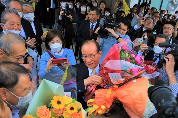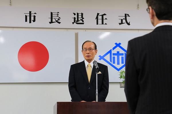 退庁式でたくさんの職員や市民の皆さんから見送られる市長