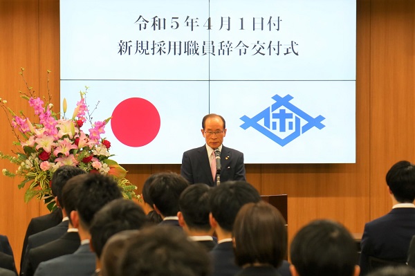 令和5年度新規採用職員辞令交付式で市職員を激励する市長