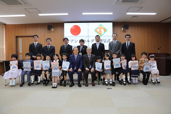 小学校の新入学児童にオアシスのあいさつが印刷された「オアシスホルダー」を贈呈し、代表児童と記念撮影をする市長