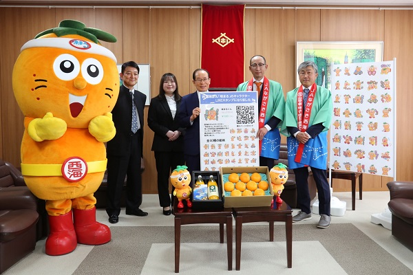 西海みかんの消費拡大PRのため、西海みかんのイメージキャラクター「味まるくん」をモチーフにしたLINEスタンプを長崎国際大学生と作成し、そのお披露目に市役所を訪れた関係者の皆さんと市長