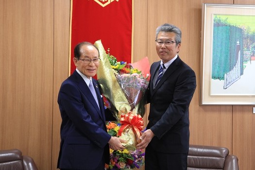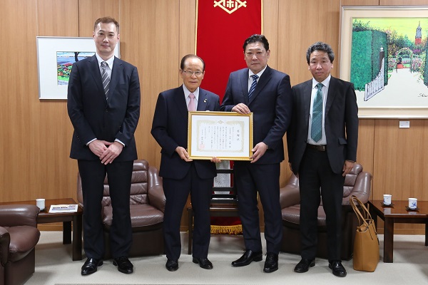株式会社SUNTACから企業版ふるさと納税にかかる寄付金をいただき、感謝状の贈呈を行う市長