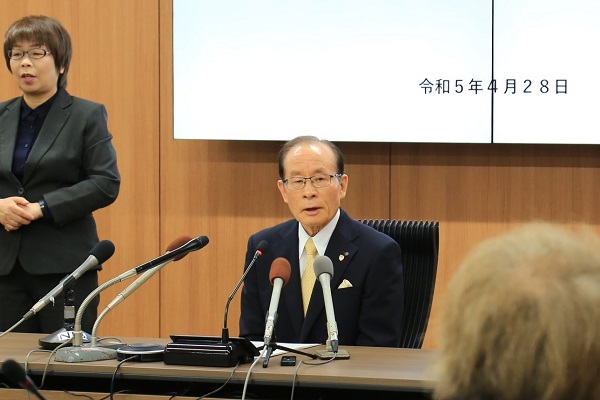 定例記者会見および退任記者会見で記者からの質問に答える市長