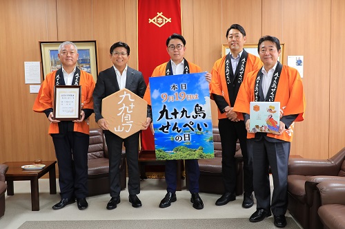 「九十九島せんぺいの日(9月19日)」の認定登録の報告のために市役所を訪れた株式会社九十九島グループの皆さんと市長