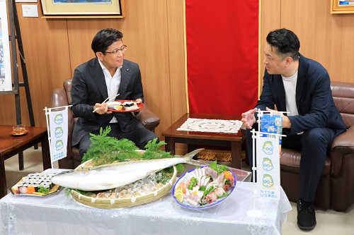 独自ブランド「九十九島ひらまささん」のお披露目に市役所を訪れた有限会社まさるフーズの皆さんと試食をする市長