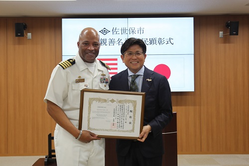 「佐世保市国際親善名誉市民」の称号を授与した米国海軍佐世保基地司令官デイビッド・J・アダムス大佐と記念撮影をする市長
