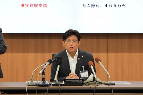 定例記者会見で記者からの質問に答える市長