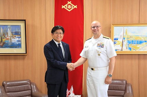 表敬のため市役所を訪れた在日米海軍司令官カール A.ラティ少将と記念撮影をする市長