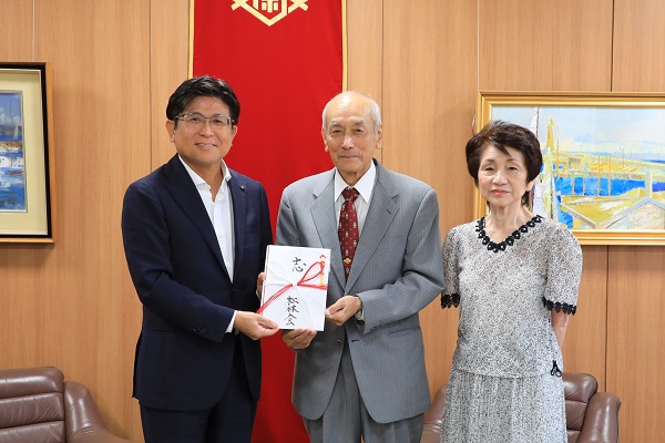 佐世保市福祉基金へ寄付金の贈呈に市役所を訪れた尚武館道場館長の安里さんと市長