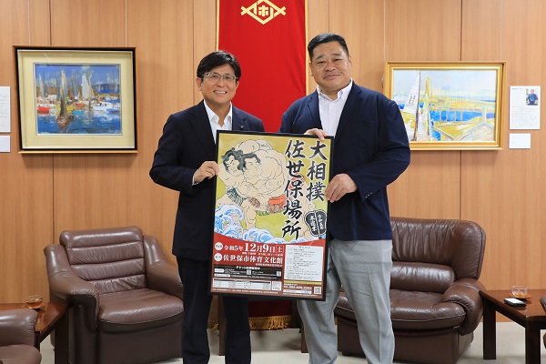 大相撲佐世保場所の開催(12月9日)に伴いに市役所を訪れた枝川親方と市長