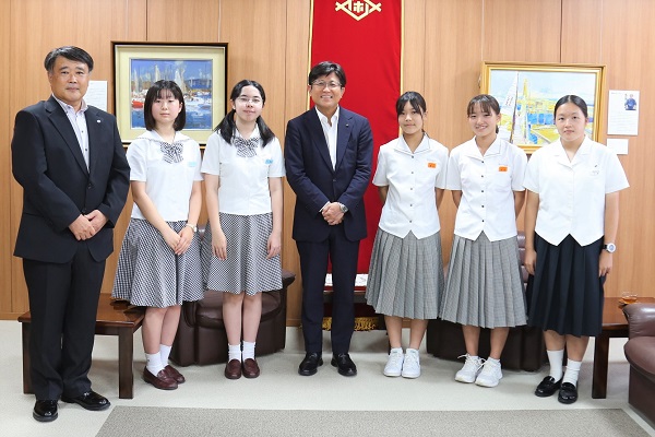 韓国坡州市との相互ホームステイによる青少年交流事業の報告に市役所を訪れた国際交流生と市長