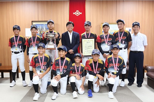 第23回全日本中学生男子ソフトボール大会の全国大会優勝の報告に市役所を訪れた長崎KSCの皆さんと市長