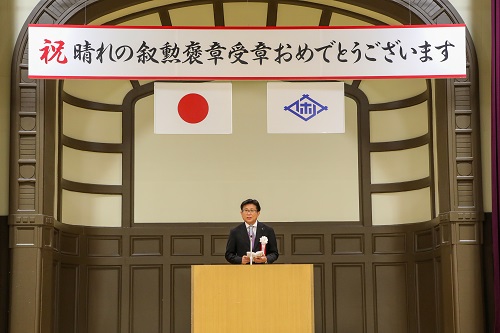 令和5年勲章褒章受章祝賀式の発起人代表あいさつをする市長