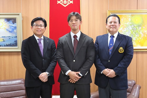 ゴールドジム・ジャパンカップ2023 ボディビル75kg超級で優勝および大会MVP、JSPORTS賞の受賞報告に市役所を訪れた浦岡慎之助選手(写真中央)と浦岡理事長(写真右)と市長