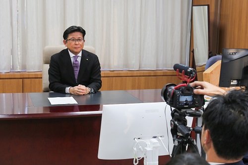 1月から新しく配信を始める市政情報番組「NEWS M SASEBO」の収録に臨む市長