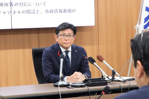 定例記者会見で記者からの質問を受ける市長