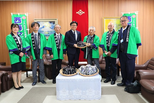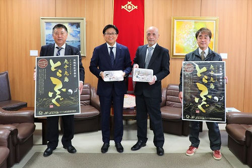 九十九島とらふぐのPRおよび贈呈のため市役所を訪れた九十九島漁業協同組合の皆さんと市長