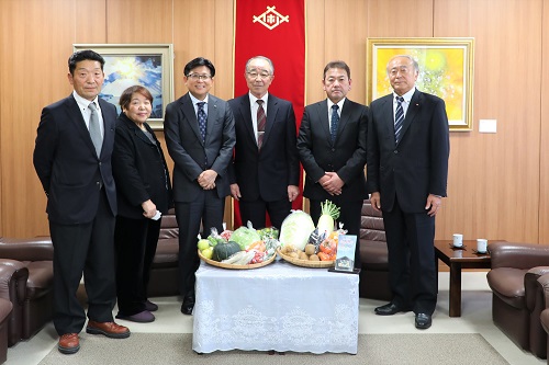 寄付金の贈呈に市役所を訪れた農事組合法人わくわくふれあい市の皆さんと市長