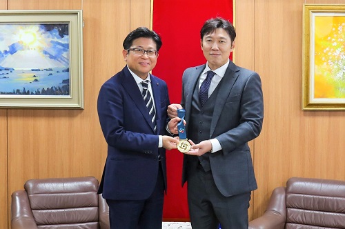 佐世保市出身で元プロ野球選手の村田善則コーチが最近の活動報告を行うため市役所を訪れ、記念撮影をする市長