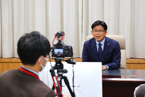 市政情報番組「NEWS M SASEBO」の収録に臨む市長