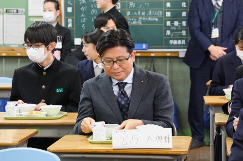 ふれあい給食で清水中学校を訪れ生徒と一緒に給食を食べる市長