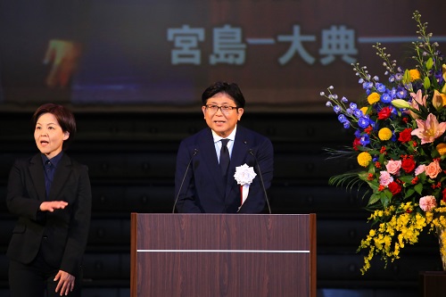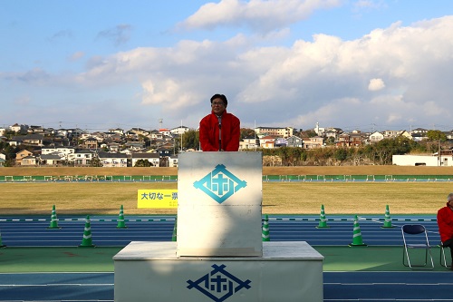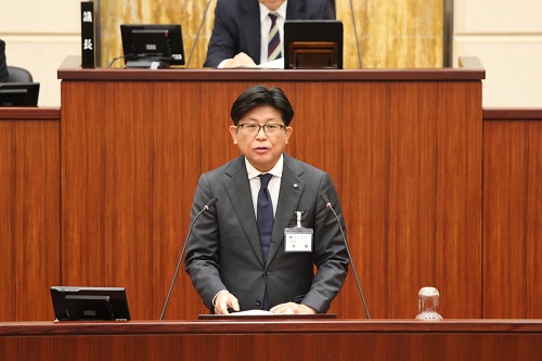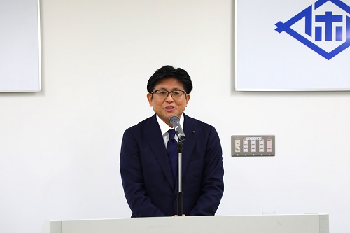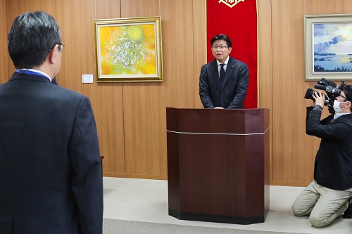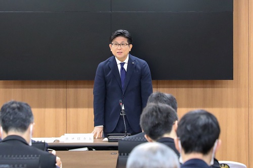 能登半島地震に係る被災地への市職員派遣の激励式であいさつをする市長