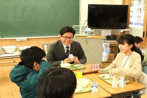 ふれあい給食で日野小学校を訪れ生徒と一緒に給食を食べる市長