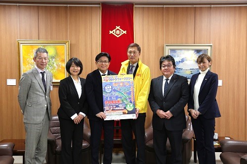 第13回佐世保-島原ウルトラウォークラリー開催のあいさつに市役所を訪れ記念撮影をする実行委員会の皆さんと市長