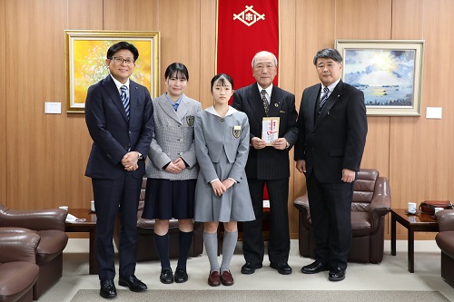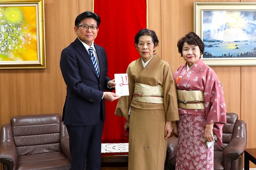 佐世保市福祉基金に寄付するため市役所を訪れた茶道裏千家淡交会の皆さんと市長