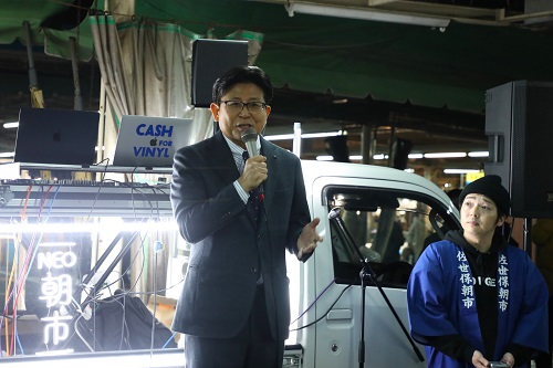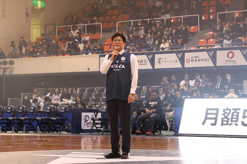 長崎ヴェルカvs京都ハンナリーズのホームゲーム戦で試合前にあいさつをする市長