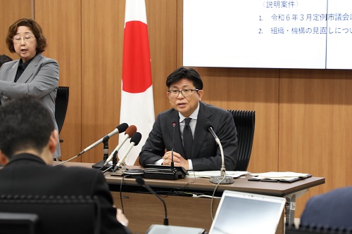 能登半島地震に係る被災地への市職員派遣の激励式であいさつをする市長