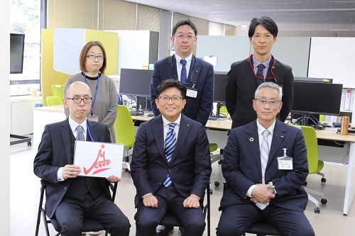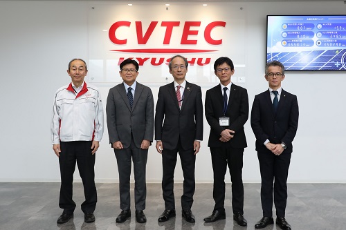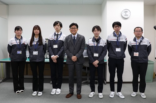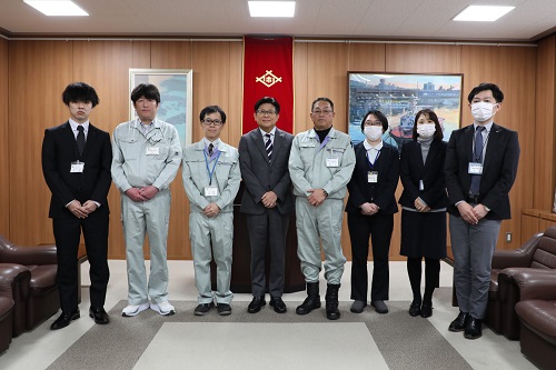 誘致企業視察で株式会社シーヴィテック九州を訪れ、記念撮影をする市長