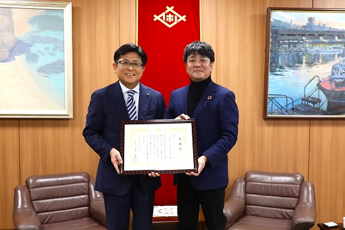 企業版ふるさと納税による寄付金の贈呈に市役所を訪れた株式会社リバースの辻CEOと記念撮影をする市長