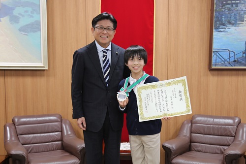 第27回NBA全国バレエコンクール小学5,6年生の部で2位を受賞した報告に市役所を訪れた高木康成さんと市長