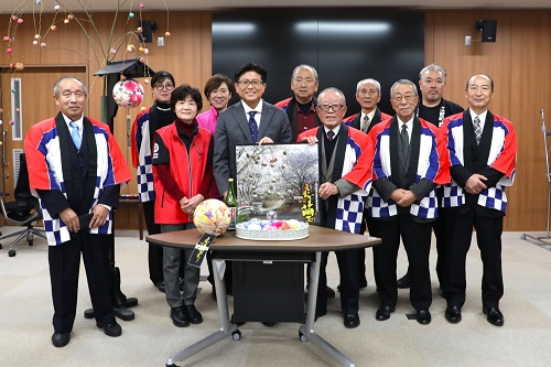 「肥前江迎繭玉まつり」と「笑迎week花手水街飾り」の開催報告に市役所を訪れた実行委員会の皆さんと市長