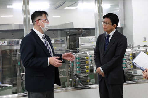 佐世保市学校給食センター視察で同センターに関する説明を受ける市長