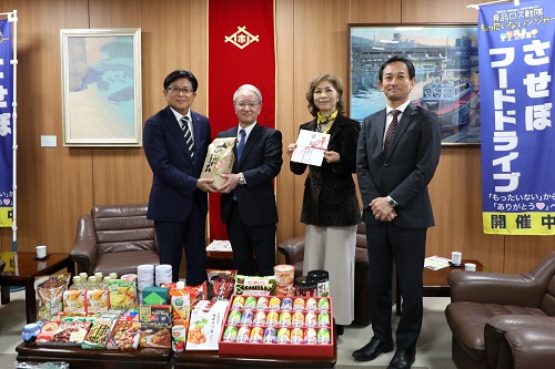 フードドライブによる食品の贈呈に市役所を訪れた関係者の皆さんと市長