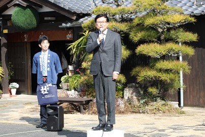 梅が枝酒造で開かれた蔵開きであいさつをする市長