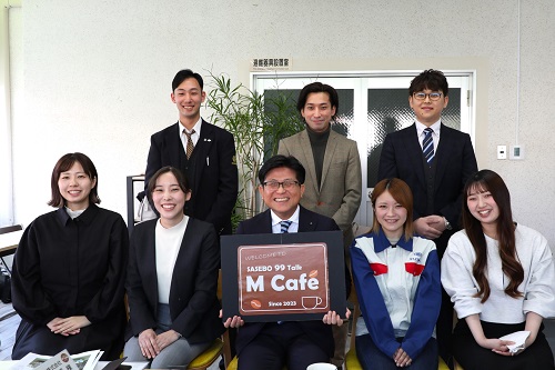 車座集会「SASEBO 99 Talk M Café」で参加者の皆さんと記念撮影する市長