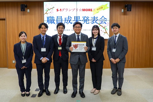 「S-1グランプリ☆MORE特別編 職員成果発表会」の活動報告後に、若手職員と記念撮影をする市長