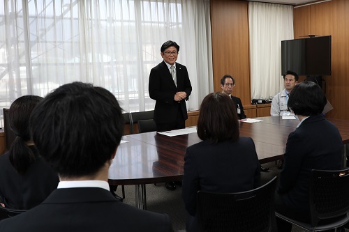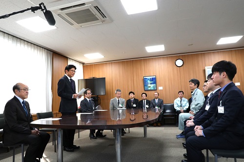 能登半島地震に係る被災地への派遣職員帰庁報告会で派遣職員に労いの言葉をかける市長