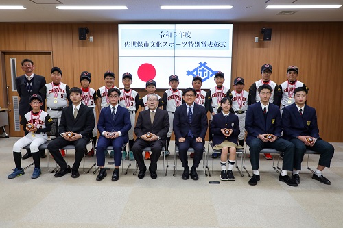 令和5年度 佐世保市文化スポーツ特別賞を受賞された皆さんと記念撮影をする市長