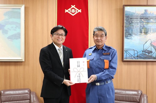 寄付の贈呈に市役所を訪れた佐世保市消防団第2中隊の大野隊長と記念撮影をする市長