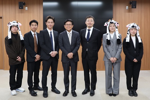 長崎和牛の輸出への取り組みの報告に市役所を訪れた、長崎県立大学発ベンチャー「西九州商事」と日系タイ企業の 「SAMURAI DIRECT」の皆さんと記念撮影をする市長