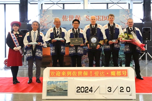 クルーズ客船「アドラ・マジック・シティ」の佐世保初寄港歓迎セレモニーで記念撮影をする市長