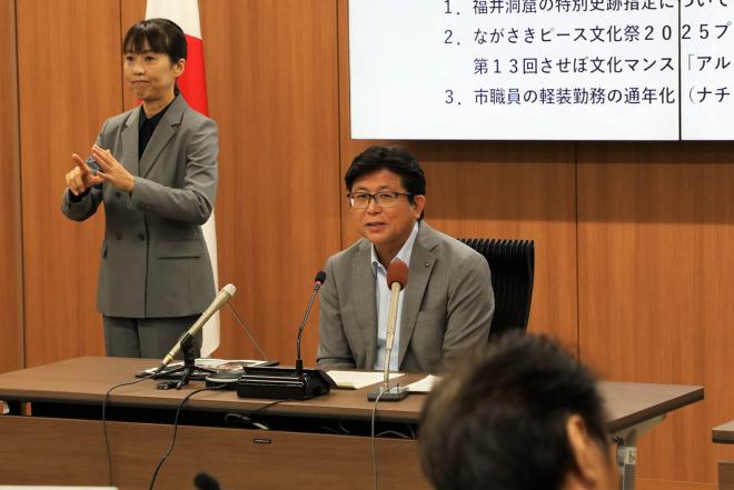 定例記者会見で記者からの質問に答える市長