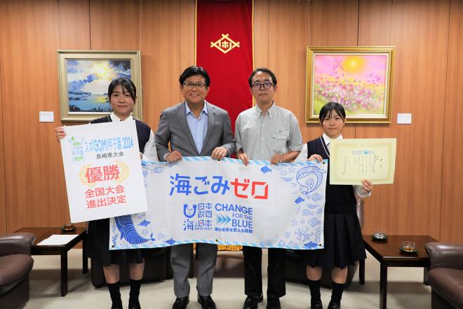 スポGOMI甲子園2024・長崎県大会で優勝した報告のため市役所を訪れた佐世保工業高等学校の生徒の皆さんと市長