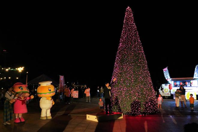 ヒカリノミナトSASEBO2024新設ツリーの点灯式で「カンパイ!」の掛け声を掛ける市長