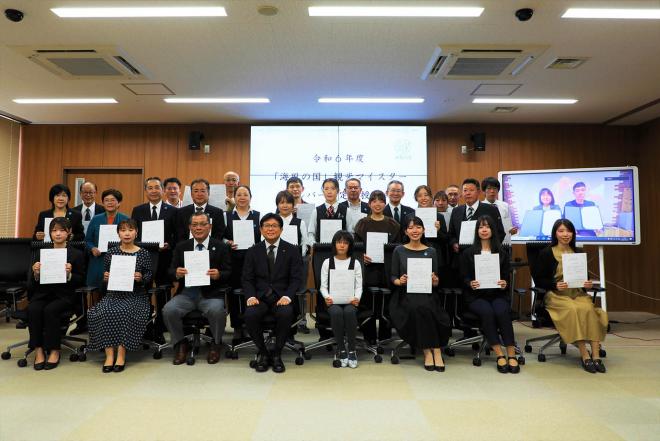 「海風の国」観光マイスターシルバー認定証授与式後に認定者の皆さんと記念撮影する市長